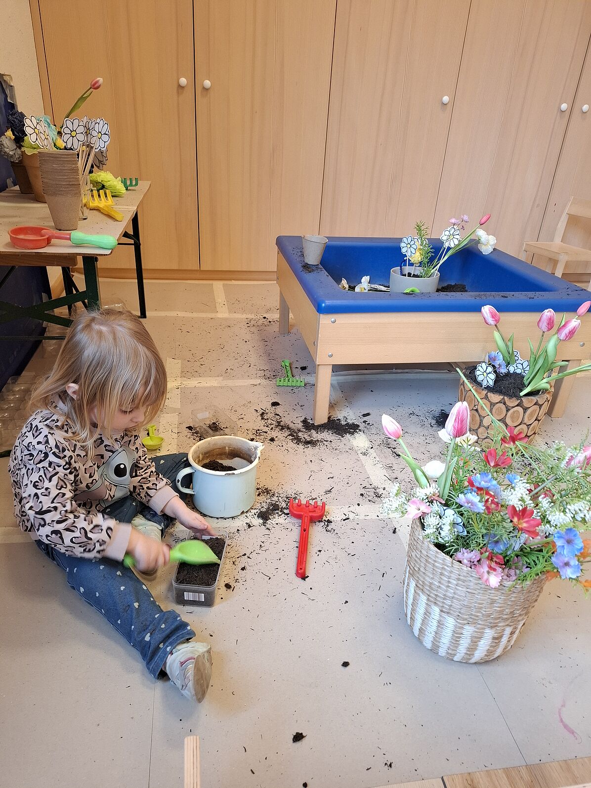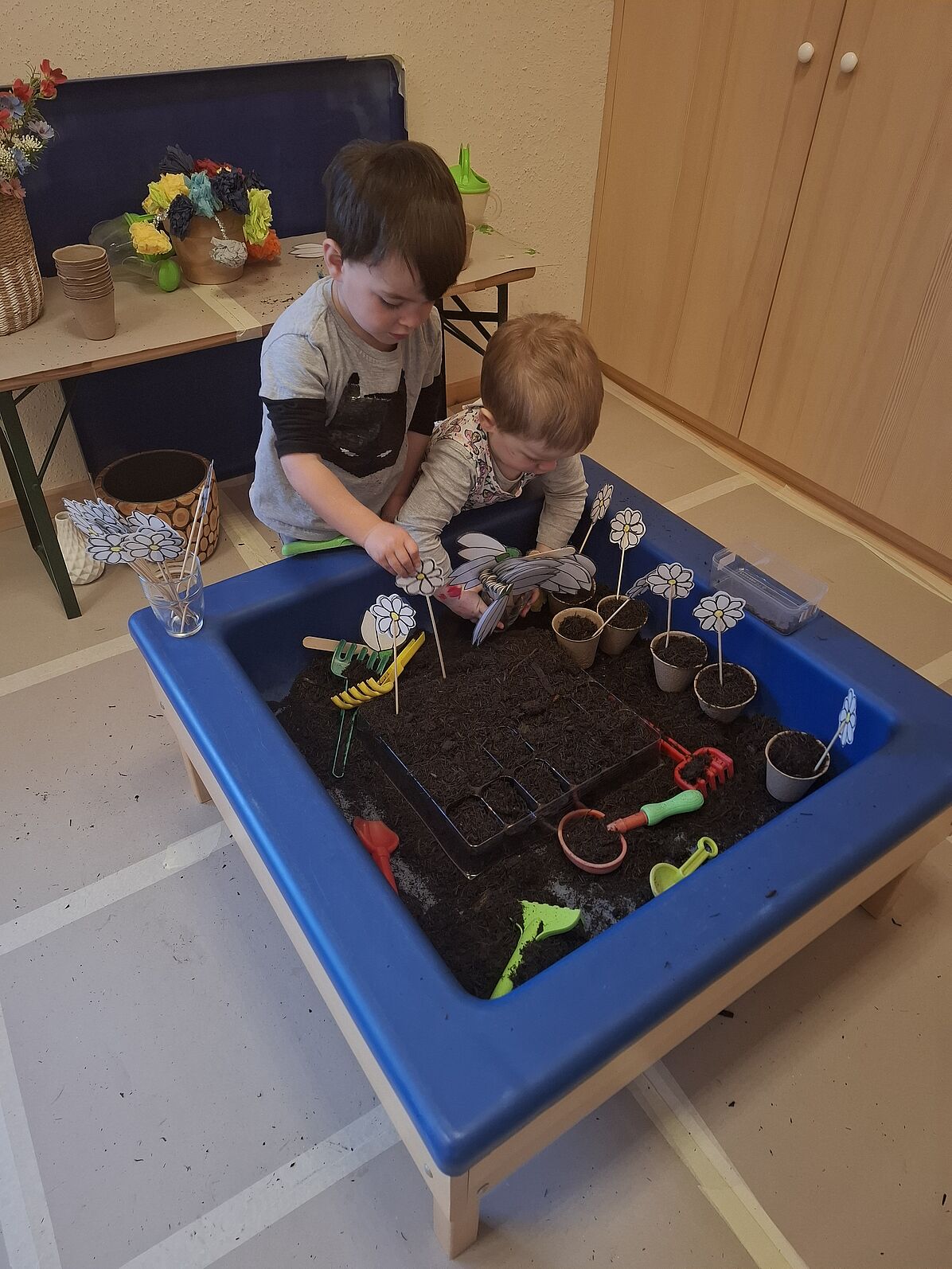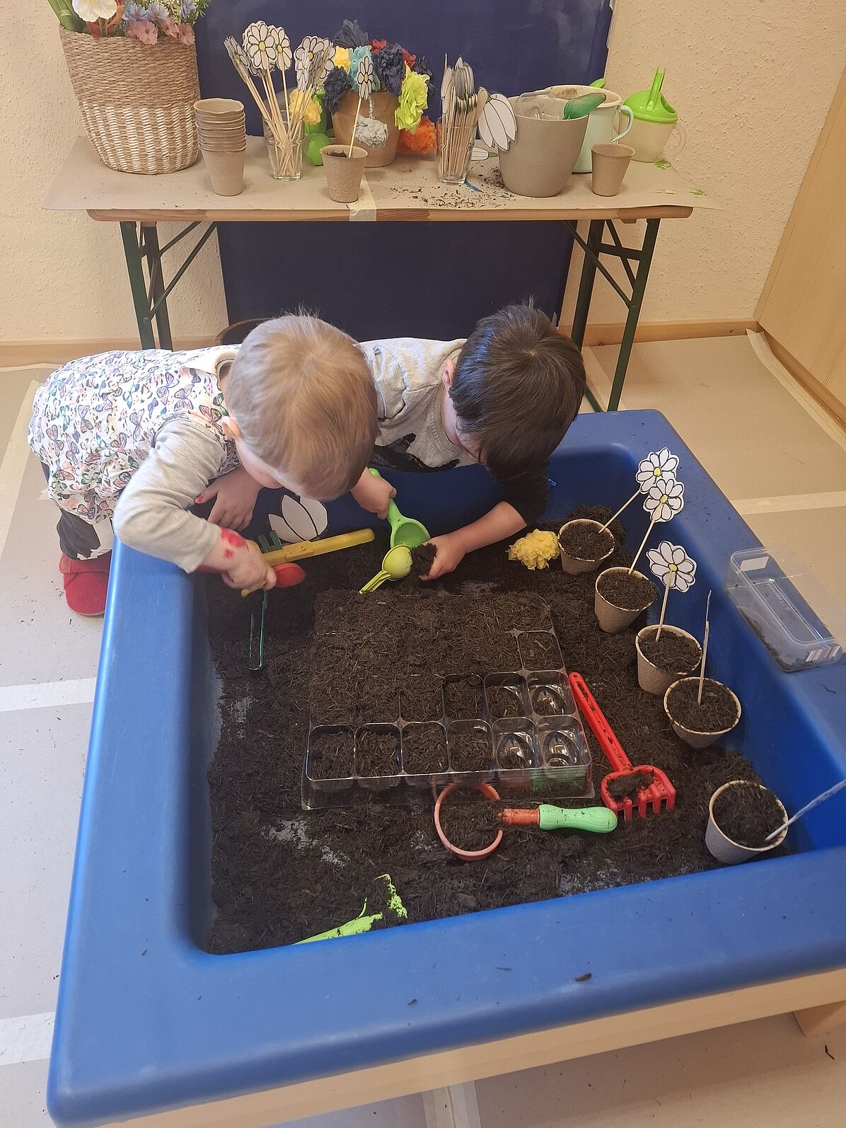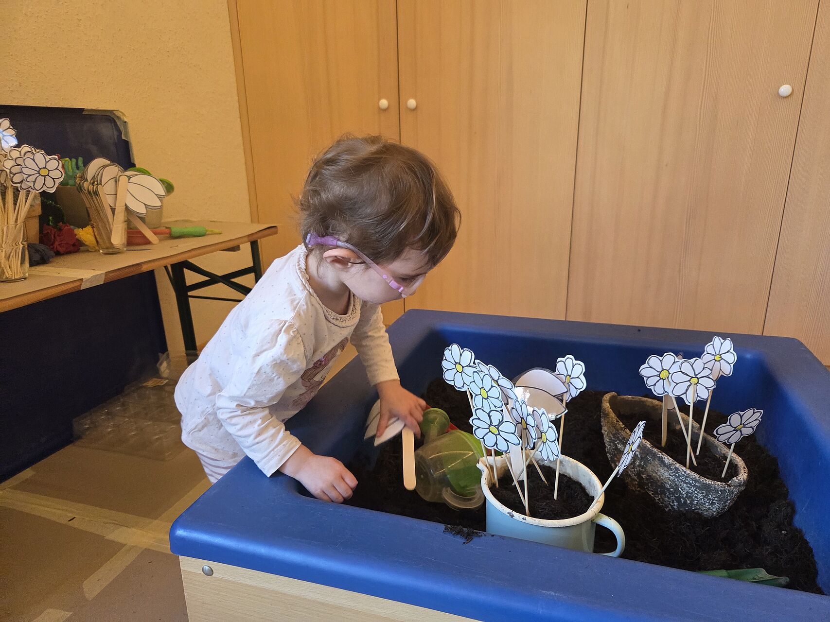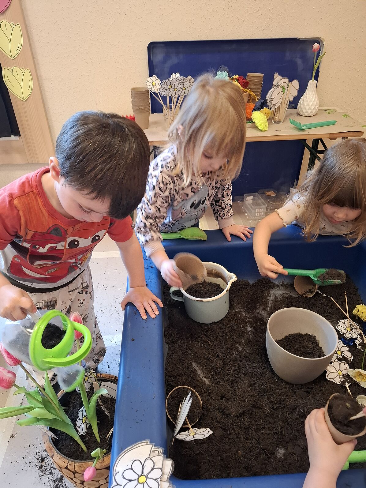 Wir sind in unserer Gärtnerei - pflanzen, spielen, säen und beobachten die Kresse beim Wachsen.