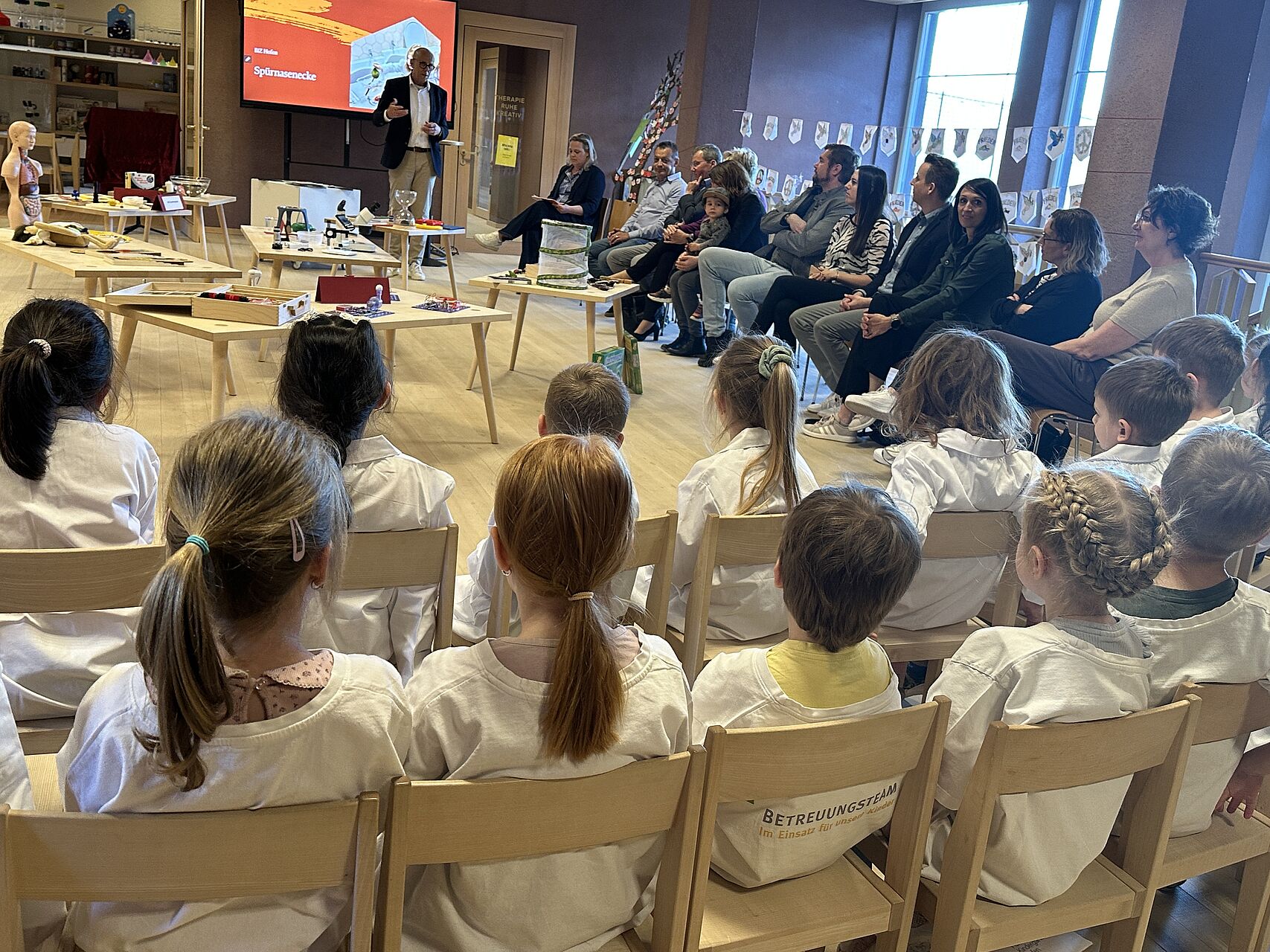 Bei der offiziellen Eröffnung am 17. April 2026 zeigte sich eindrucksvoll, wie selbstverständlich die Spürnasenecke bereits Teil des pädagogischen Alltags geworden ist. Die Pädagoginnen nutzen den Bereich schon regelmäßig. Bei der Eröffnung führten die Kinder selbstbewusst mehrere Experimente vor und erklärten den Erwachsenen ihre Beobachtungen.